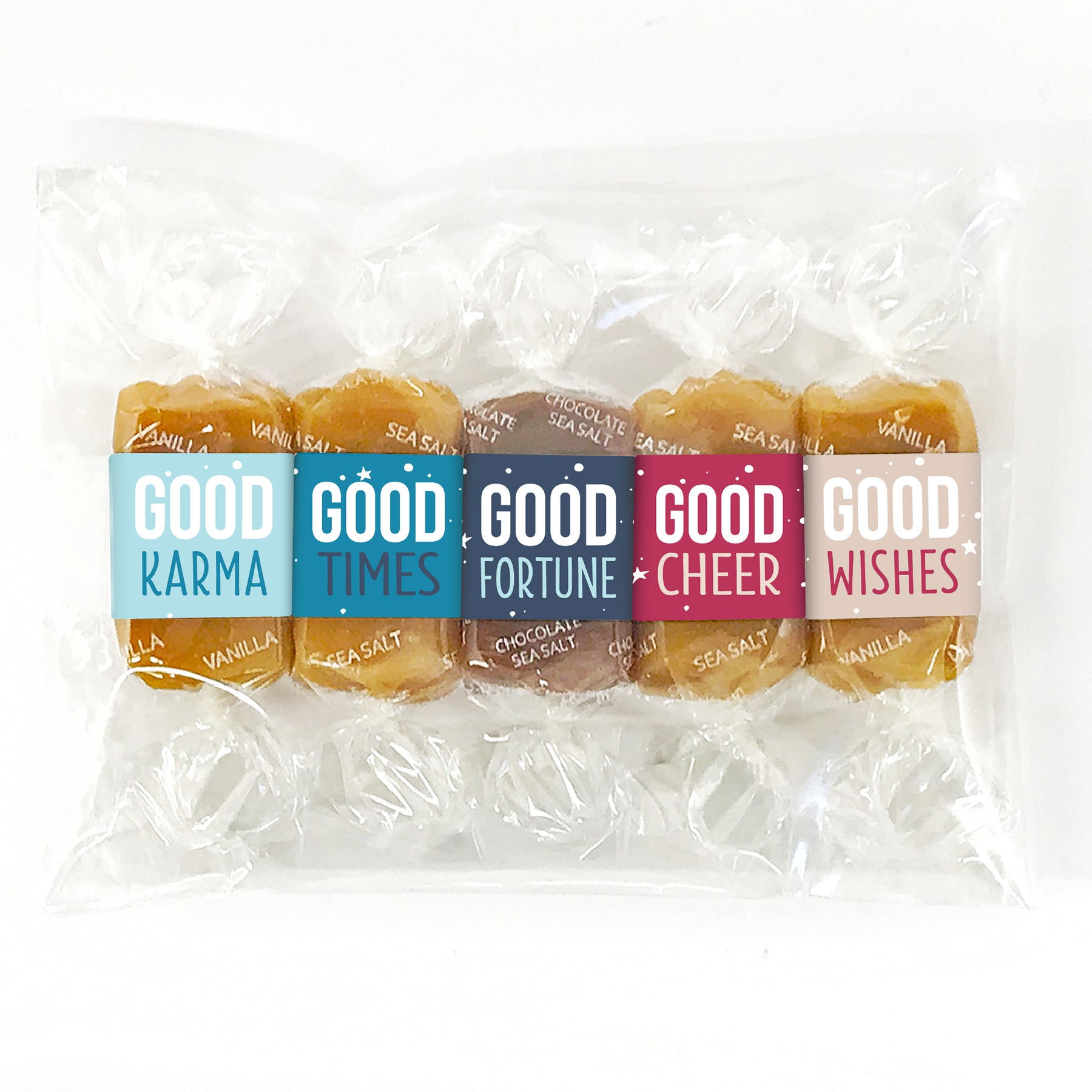 5 pieces of gourmet caramels with colorful wrappers in a clear cello packet. Caramel wrappers feature positive quotes and designs of good wishes, good cheer, good fortune, and more.