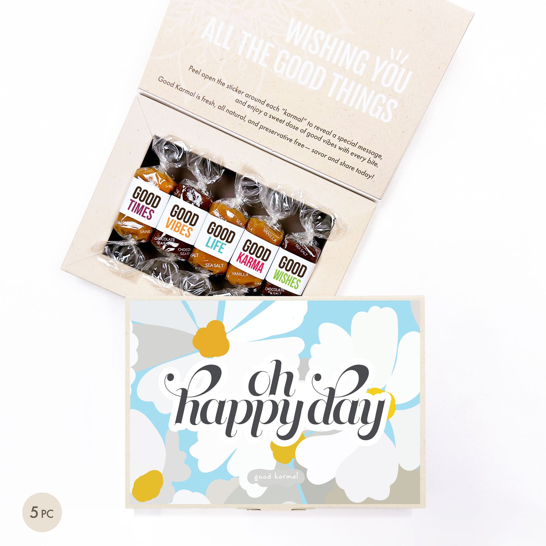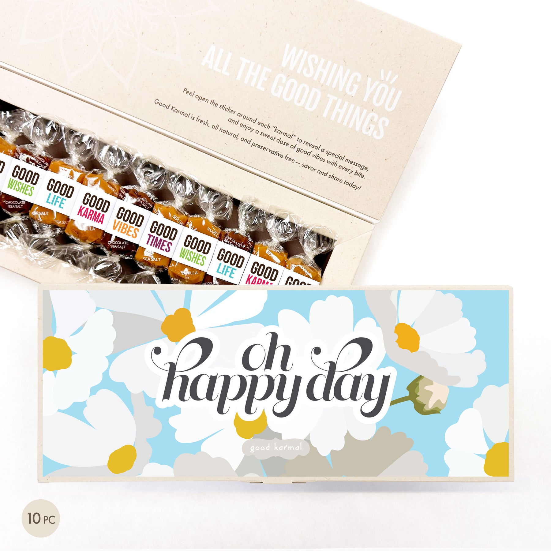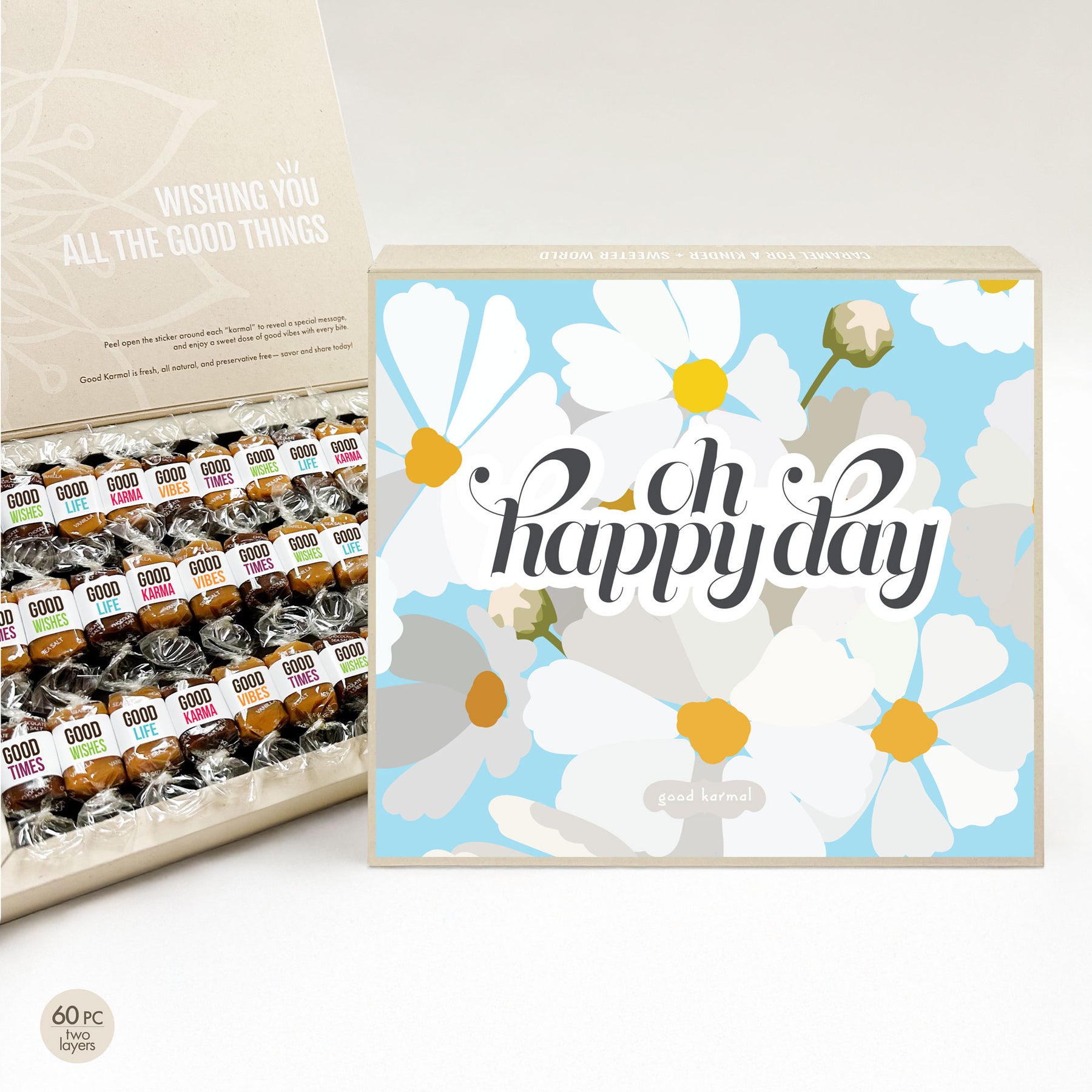 This cheerful caramel gift box is made for life’s sweetest moments—big celebrations, happy milestones, birthdays, new beginnings, big news, and the little occasions in between. Filled with gluten-free, gourmet caramel, the Oh Happy Day Caramel Gift Box is a delicious way to celebrate moments worth sharing.