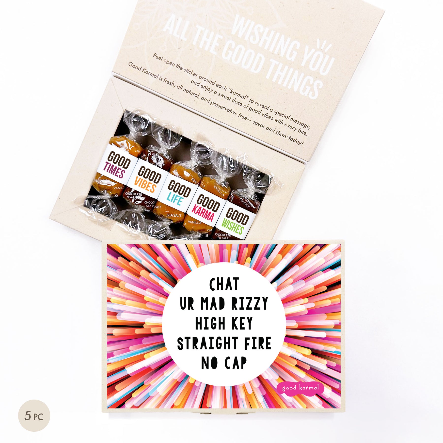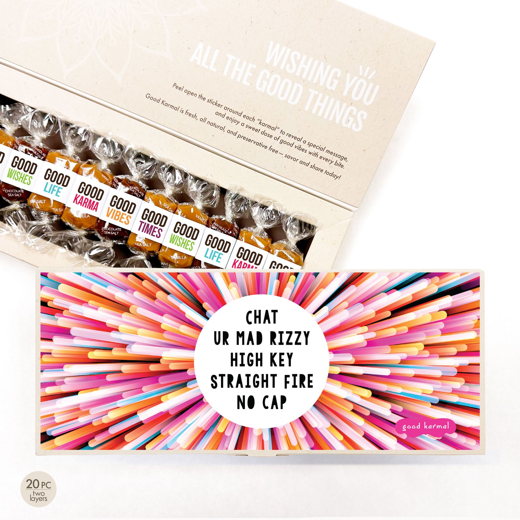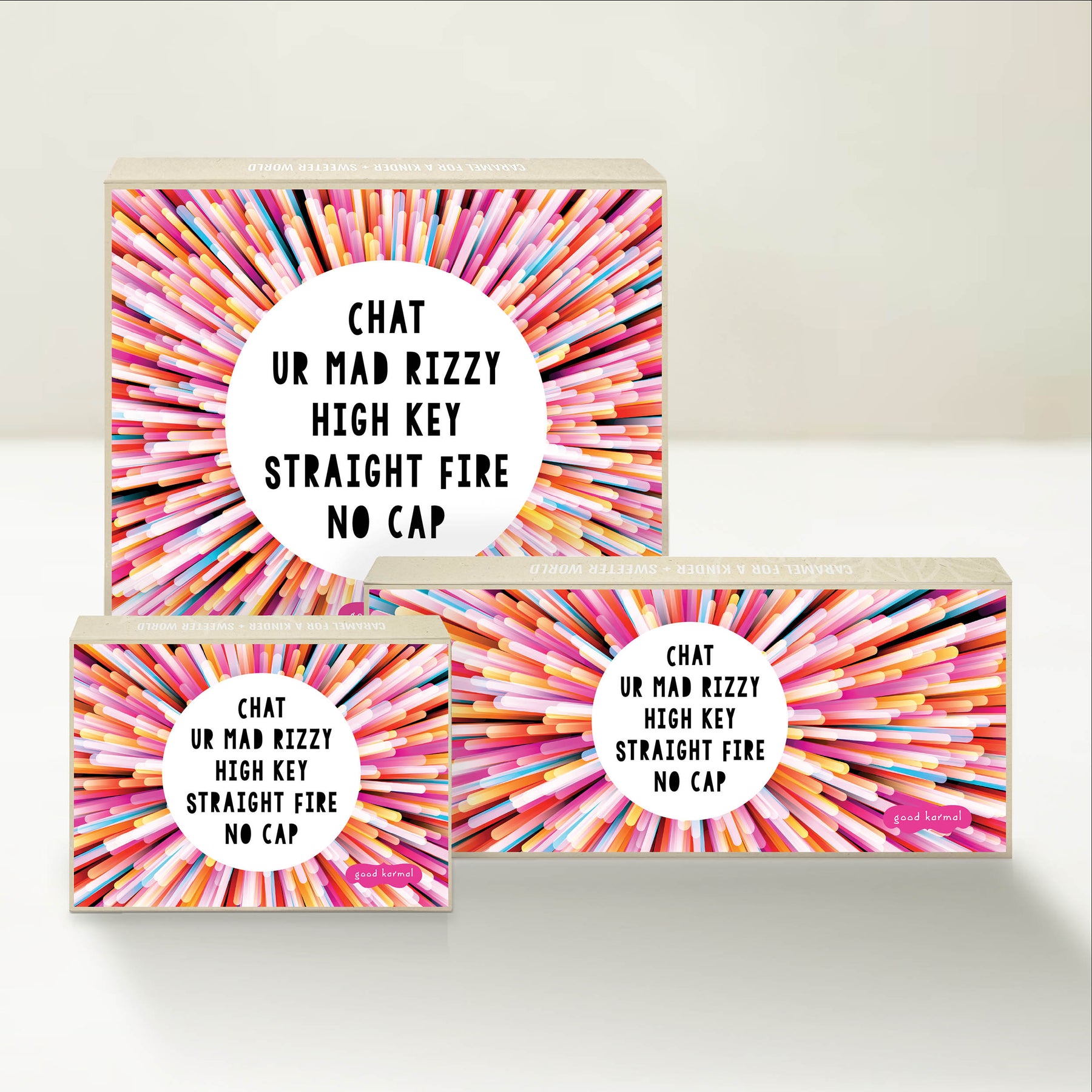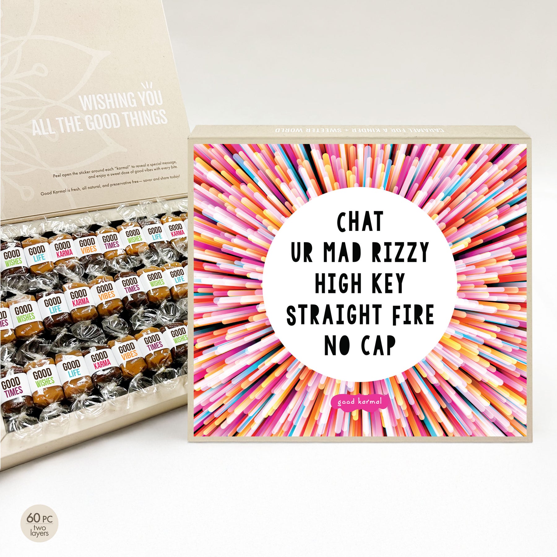 This candy box is straight fire (which means exceptionally good in teen slang). Wondering what the other words mean? Chat = Everyone. You all. Dude. Bruh. Mad Rizzy = Very charming or charis(rizz!)matic. High Key = Sincerely. No Cap = No lie.