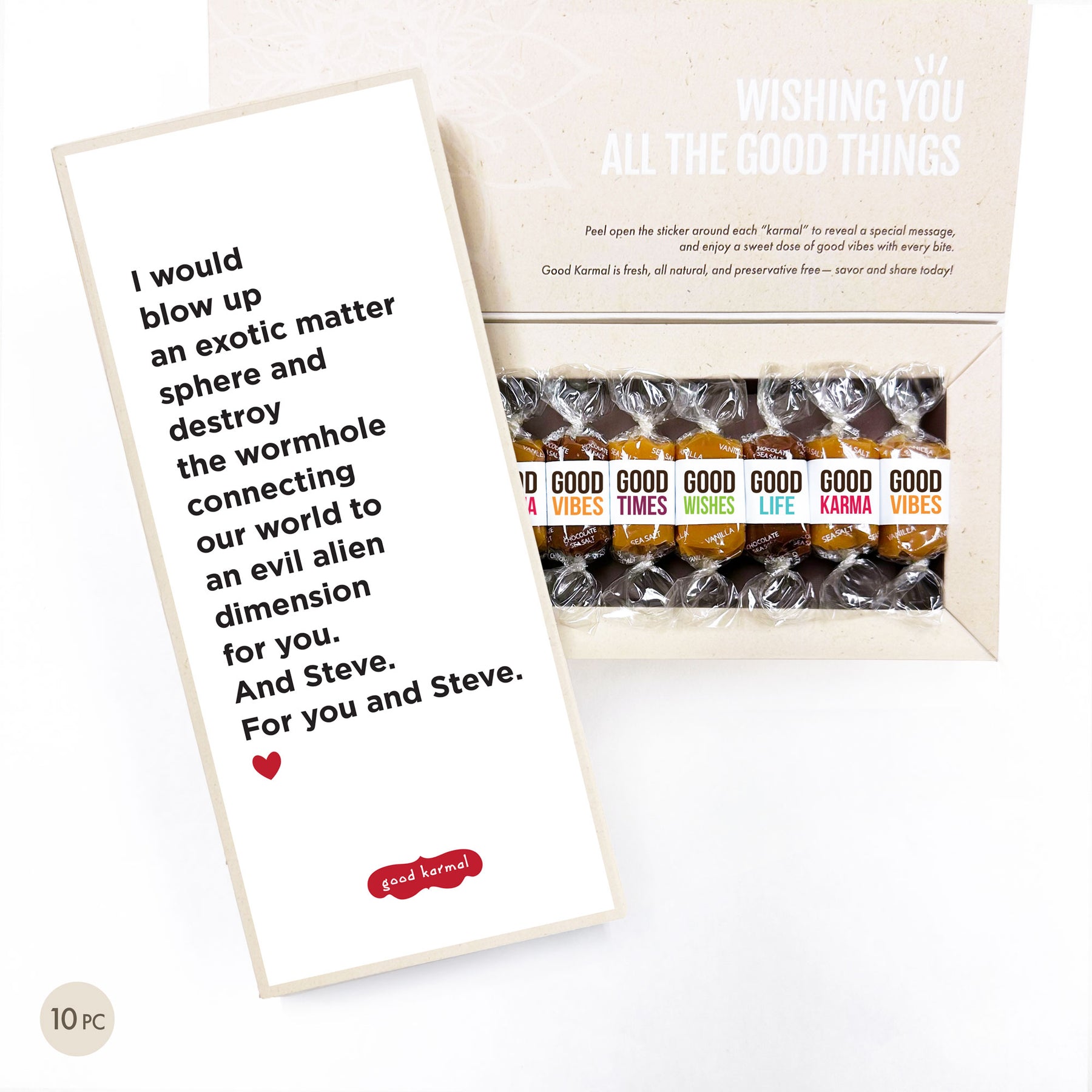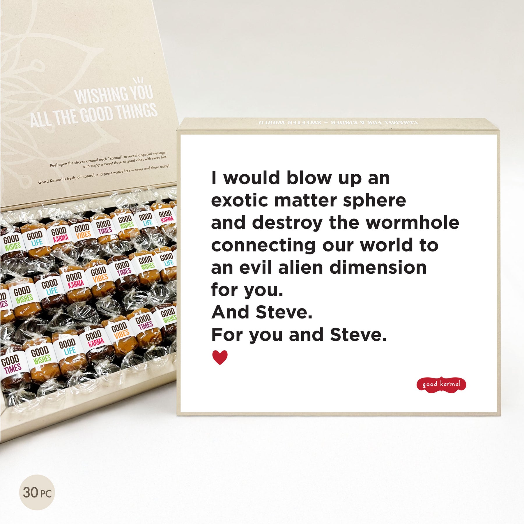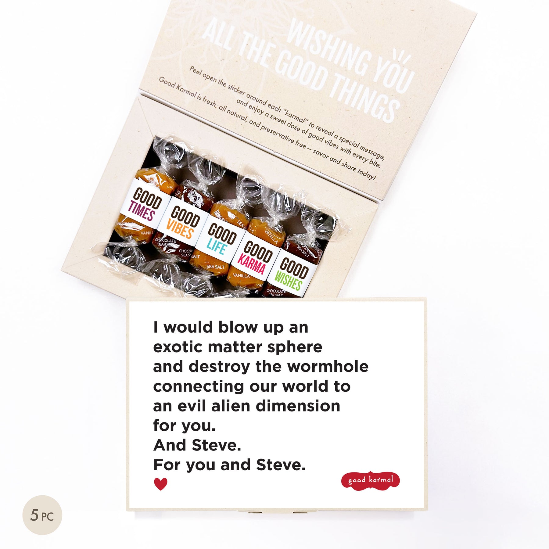The front of each caramel wrapper features sweet motifs like Good Times, Good Life, and Good Vibes, while the inside features one of our year-round inspirational quotes.